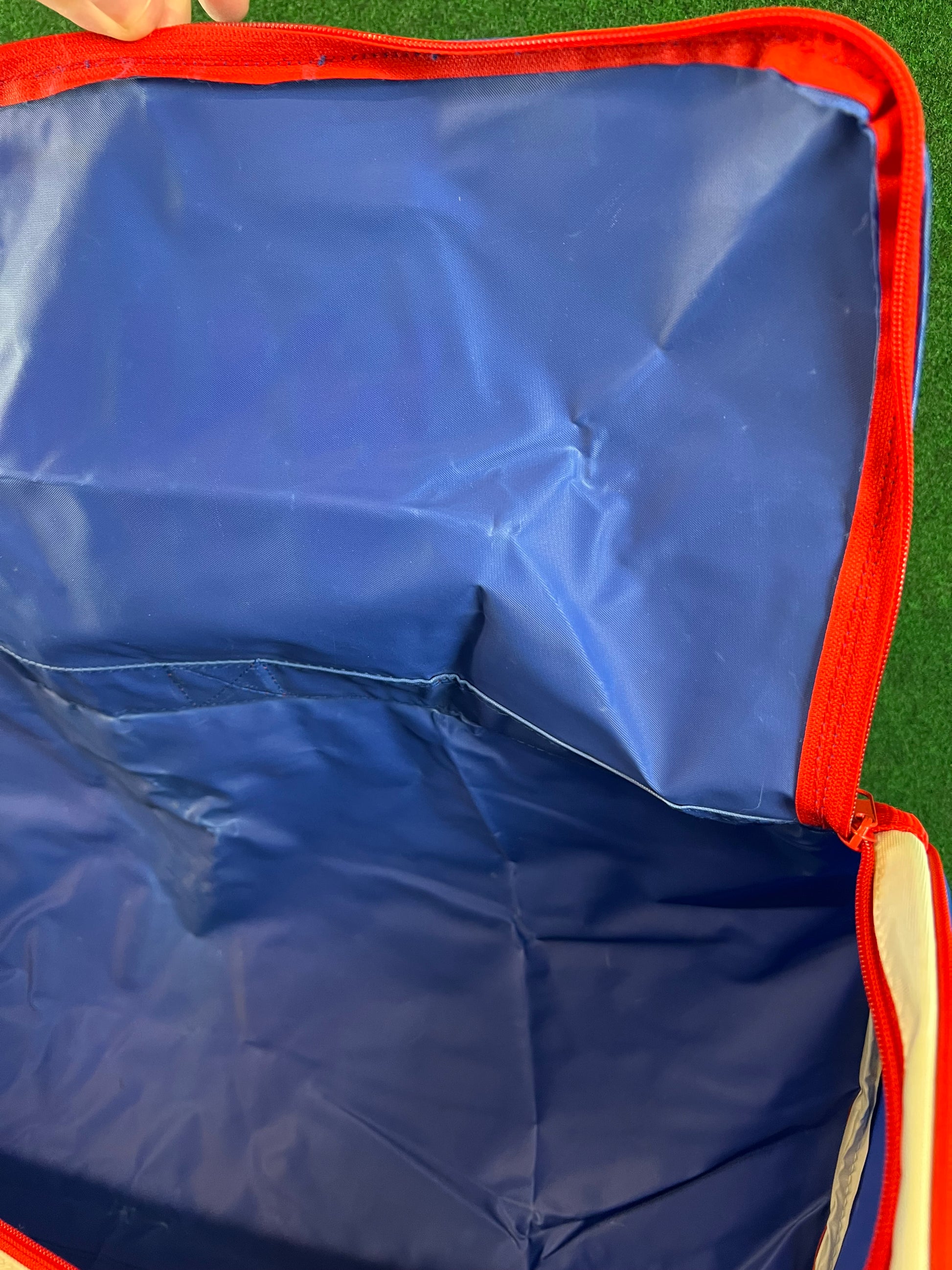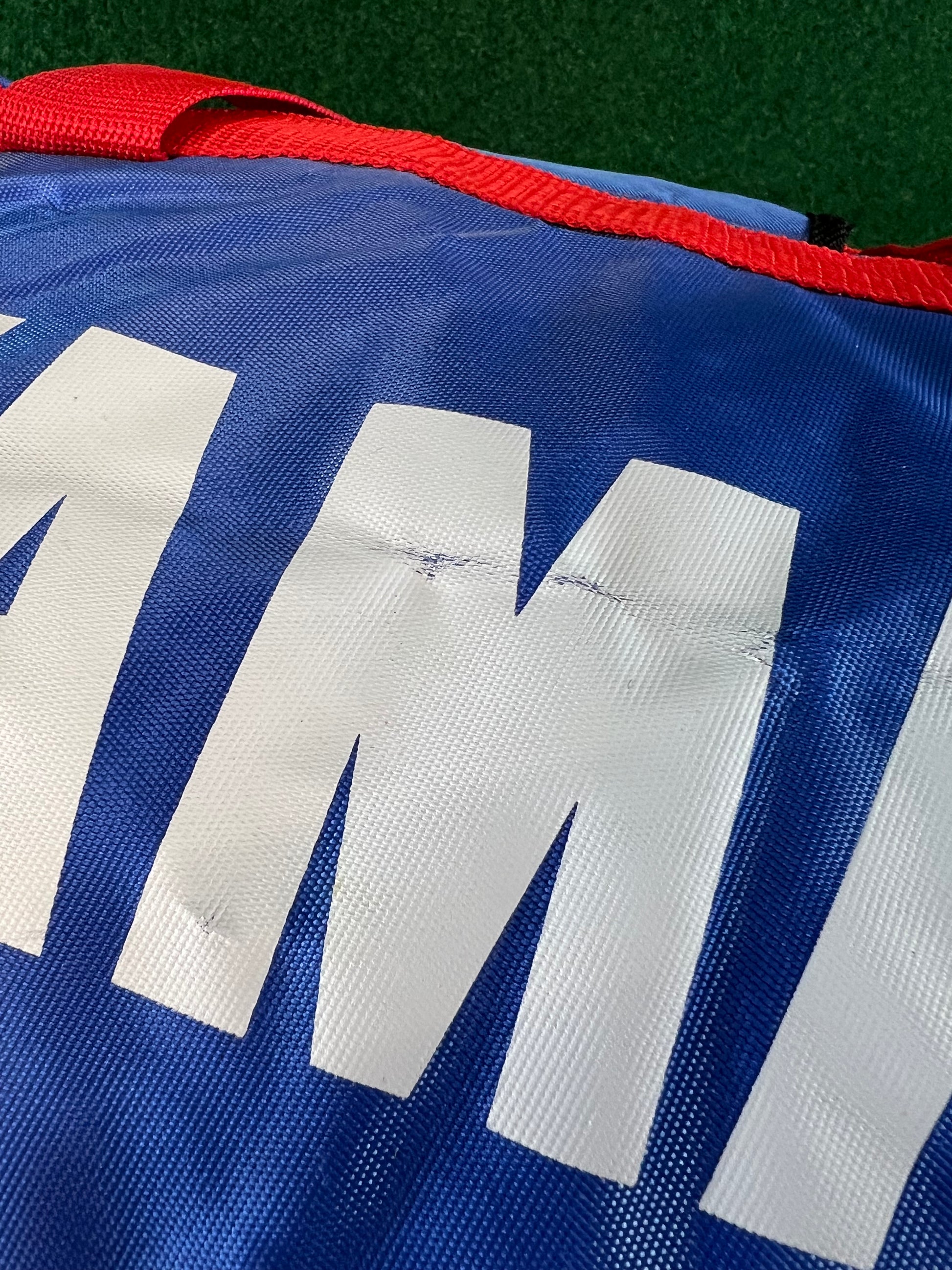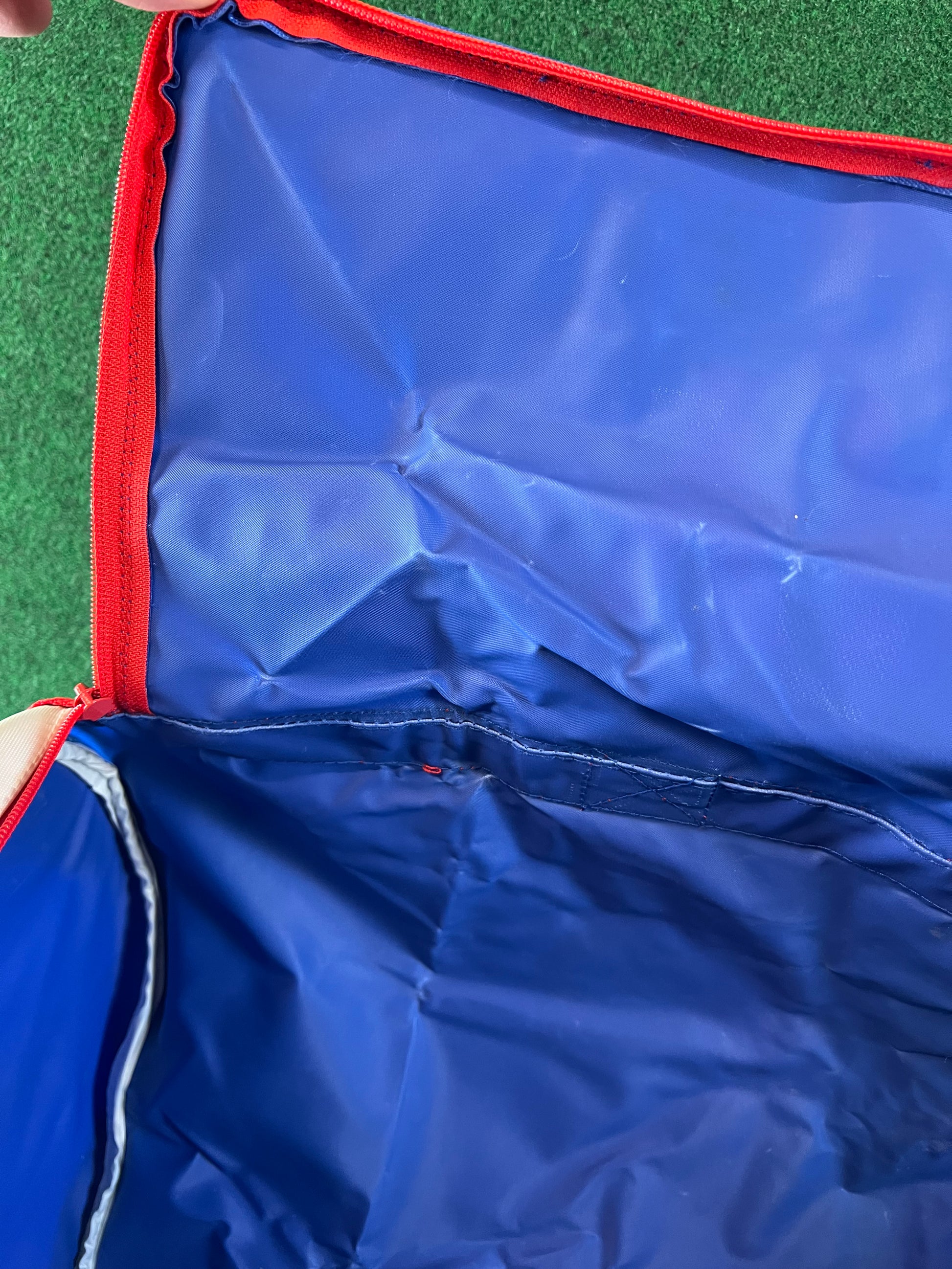 Condition: Very good for age. Some faded areas around center where it has been folded. Shoulder strap is brand new unused. Graphics and colors on the exterior look great!