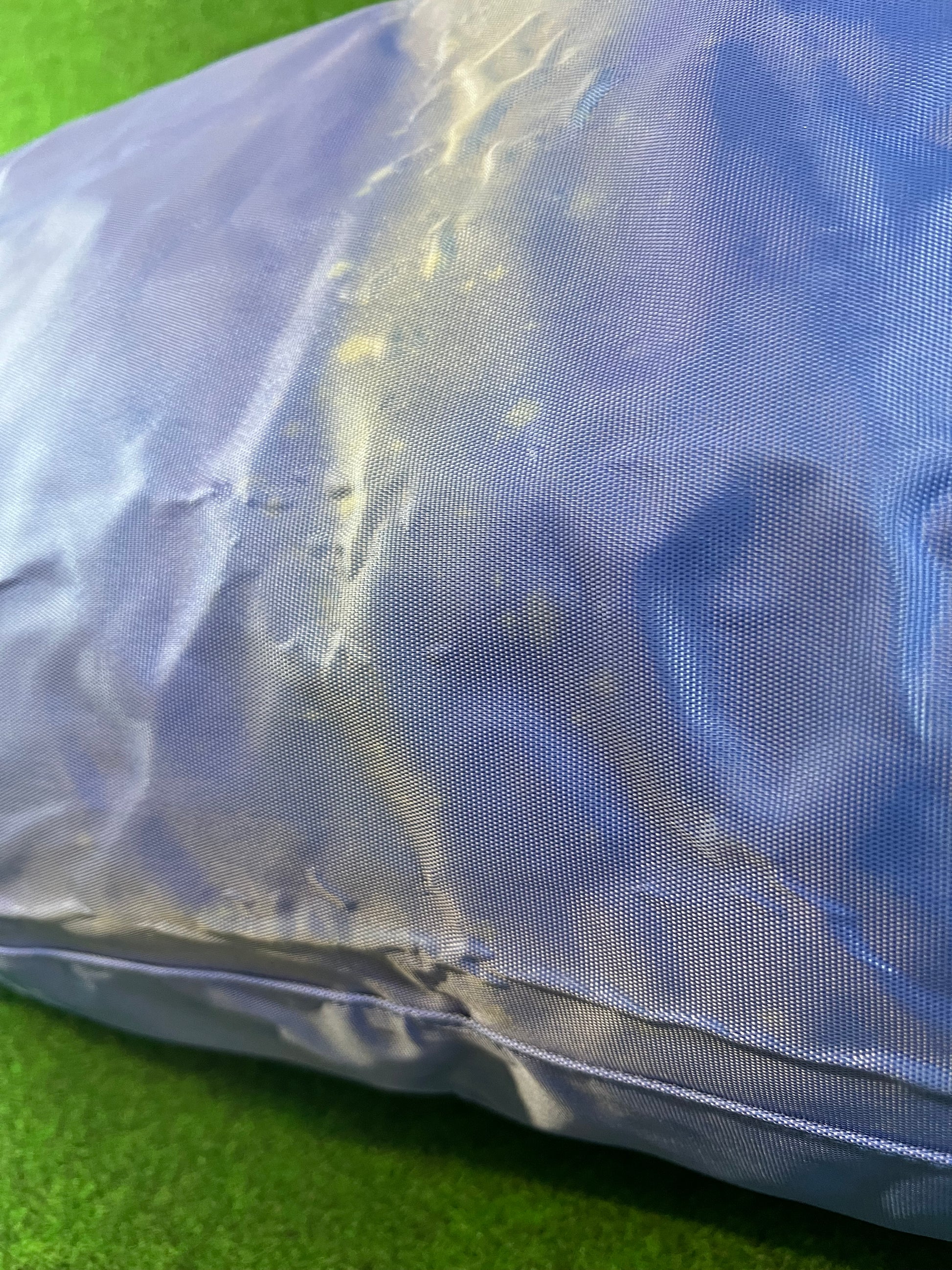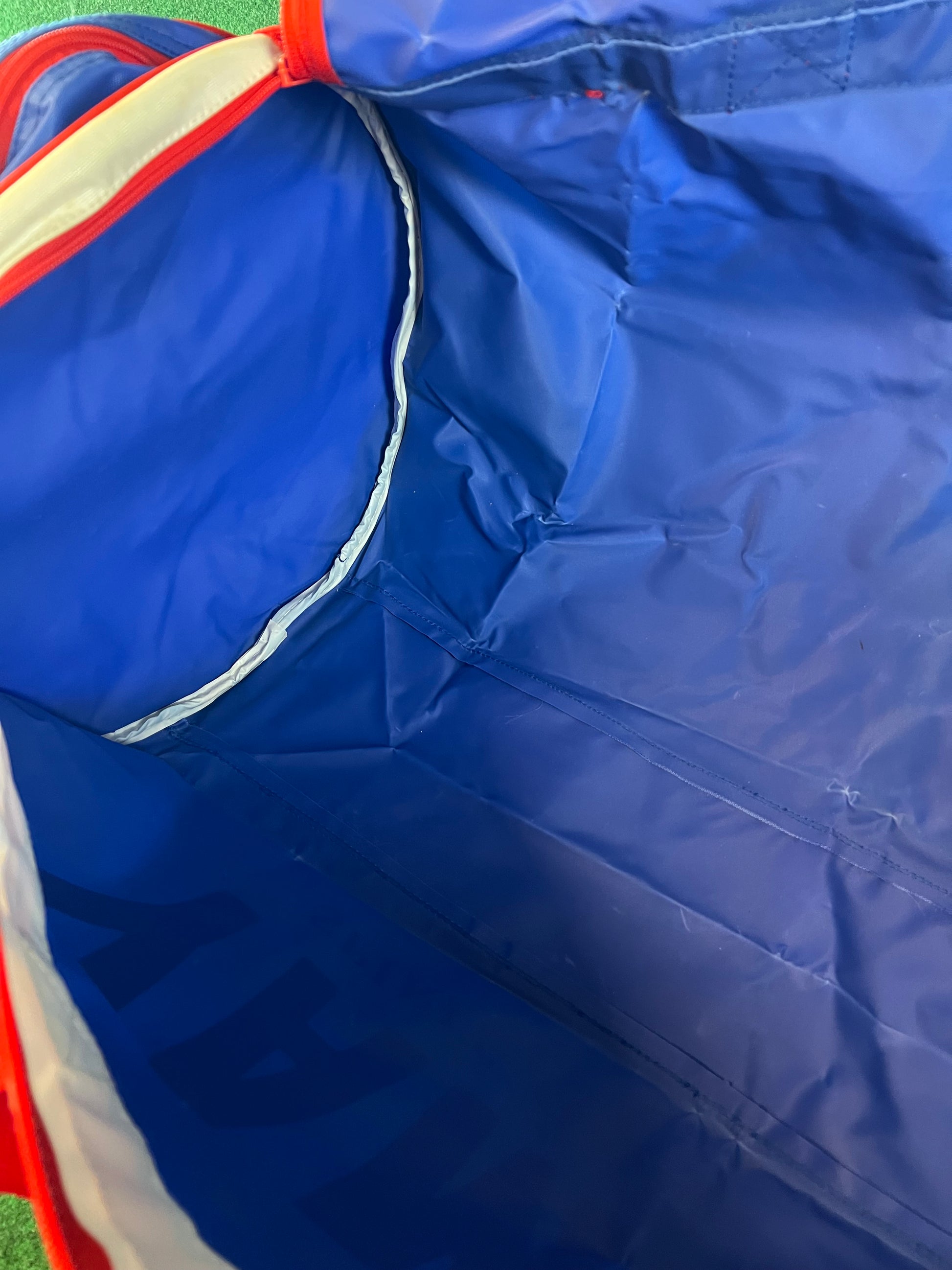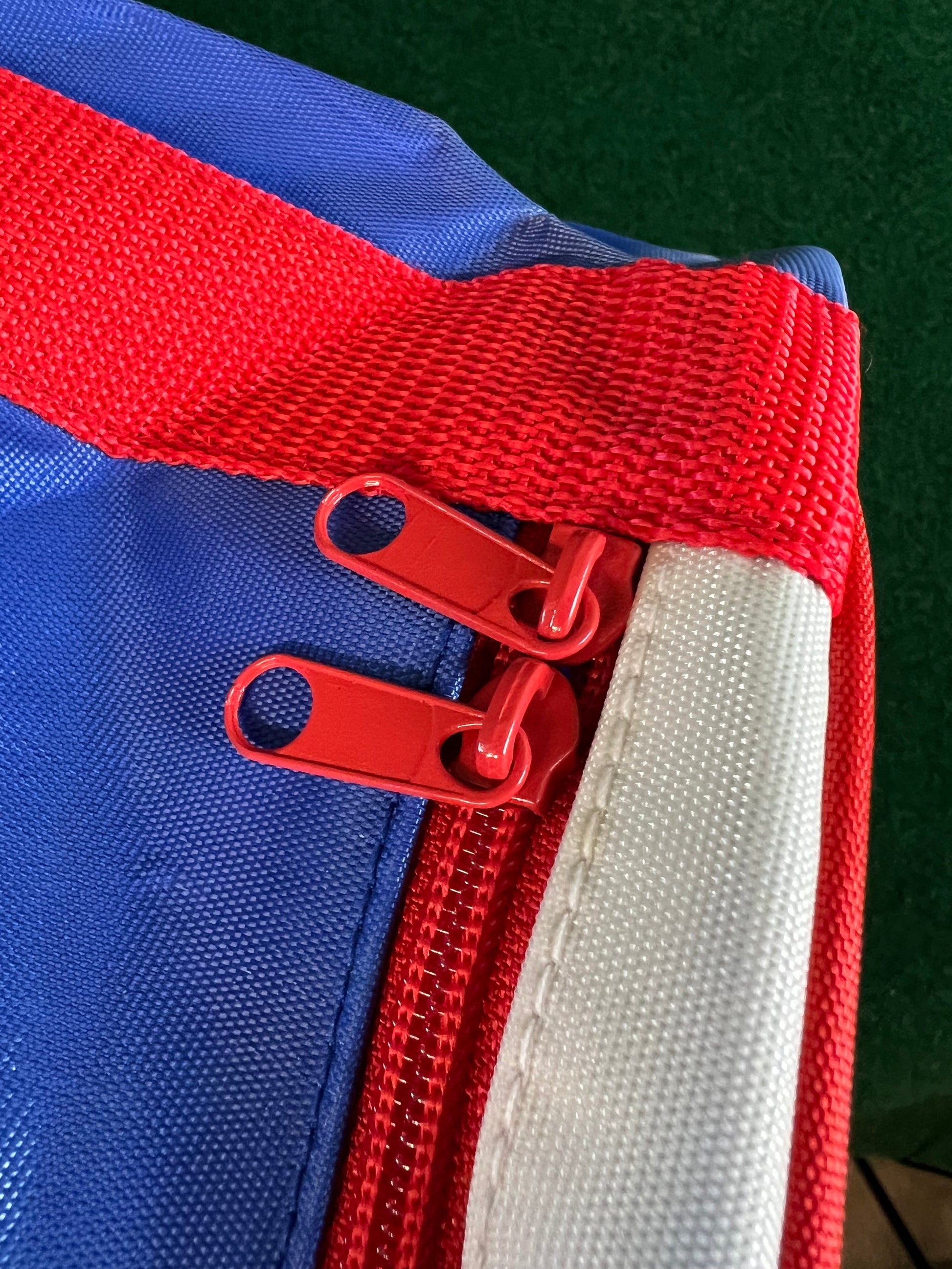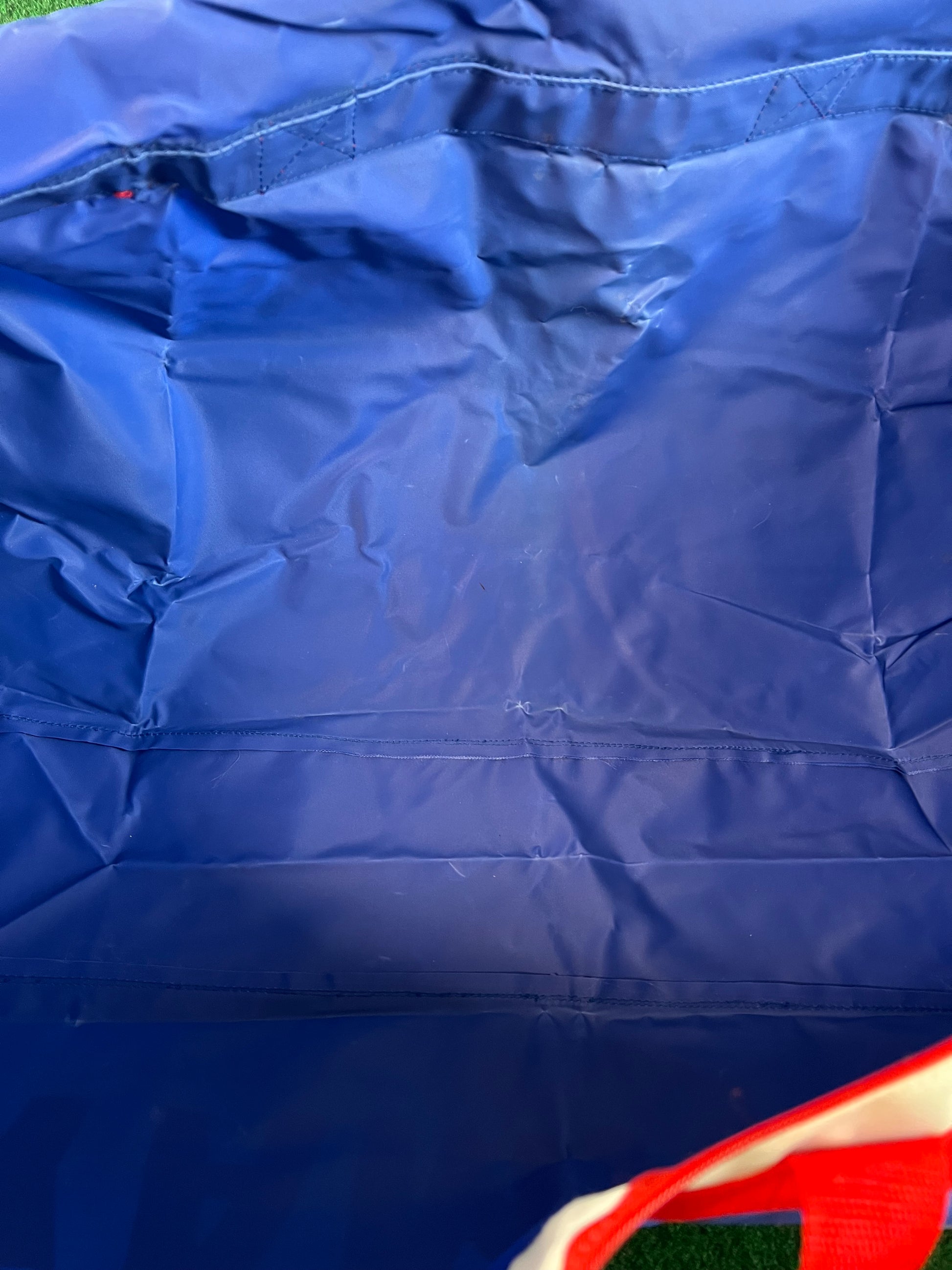 Condition: Very good for age. Some faded areas around center where it has been folded. Shoulder strap is brand new unused. Graphics and colors on the exterior look great!